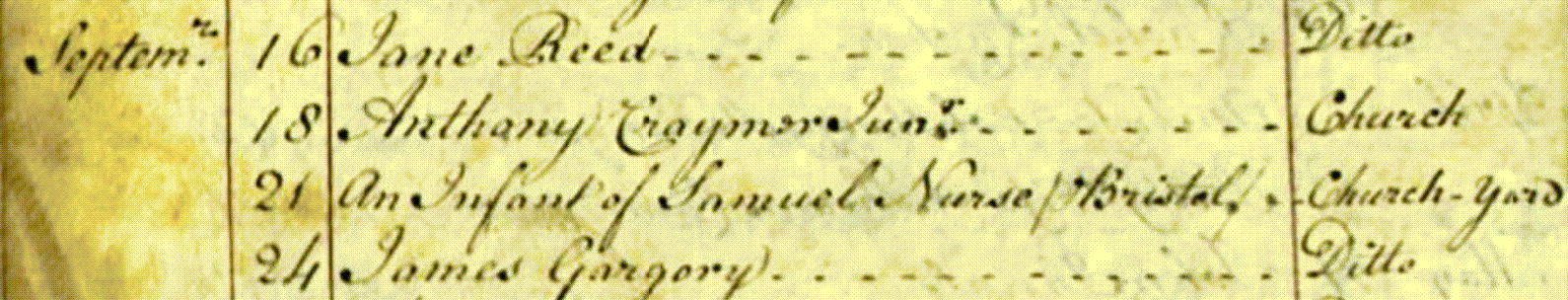 Although there is no direct evidence, it appears that at least four; Sarah, Robert, Thomas and Thomas (and maybe five, William) of Samuel and Rachel’s children died in infancy. Most of them were buried at St John’s Keynsham, Rachel’s ancestral home. Sarah died and was buried on the 21st September 1777. Although the entry only says an “infant” of Samuel Nurse of Bristol, I believe that infant was Sarah. This entry (see Figure 3.34) indicates that by September 1777 Samuel was still resident in Bristol.76