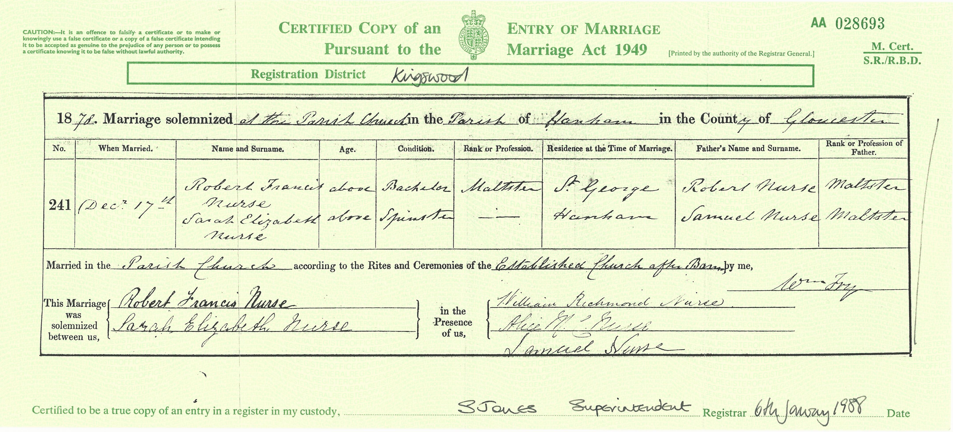 Samuel, Robert’s uncle, lived in the house with his daughter Sarah Elizabeth (who was born 11th March, 1850). Presumably Robert Francis worked here under Samuel’s guidance as he learned the family business. It was probably during this time that he formed his relationship with Samuel’s daughter (his cousin), since on 17th December 18784 they were married in the parish church of Hanham Abbots.